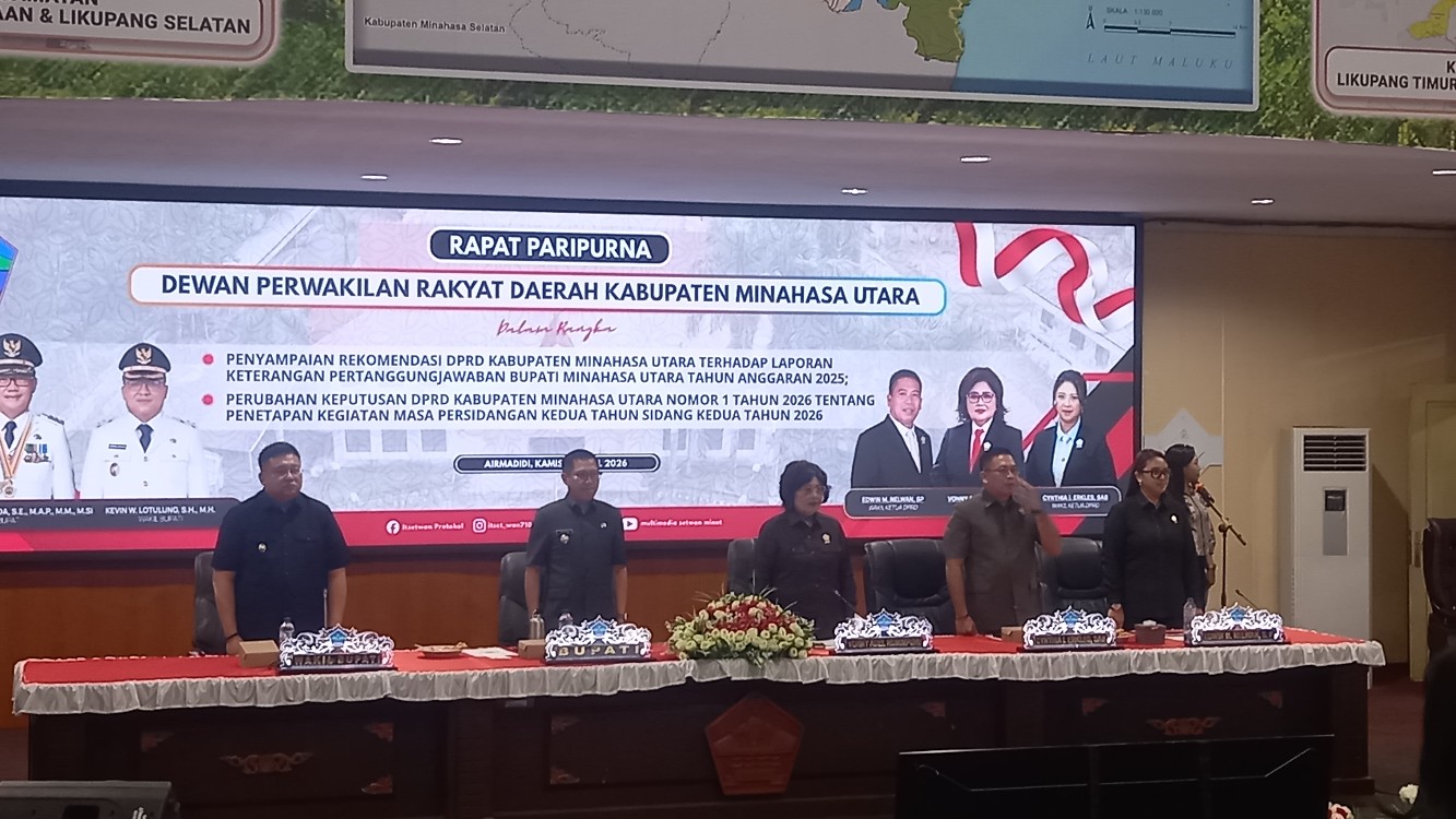 KOSMOMANADO.COM,Minut_Dewan Perwakilan Rakyat Daerah (DPRD) Kabupaten Minahasa Utara menggelar rapat paripurna penyampaian rekomendasi atas Laporan Keterangan Pertanggungjawaban (LKPJ) Tahun Anggaran 2025, di Gedung Tumatenden, Kamis (09/04/26).